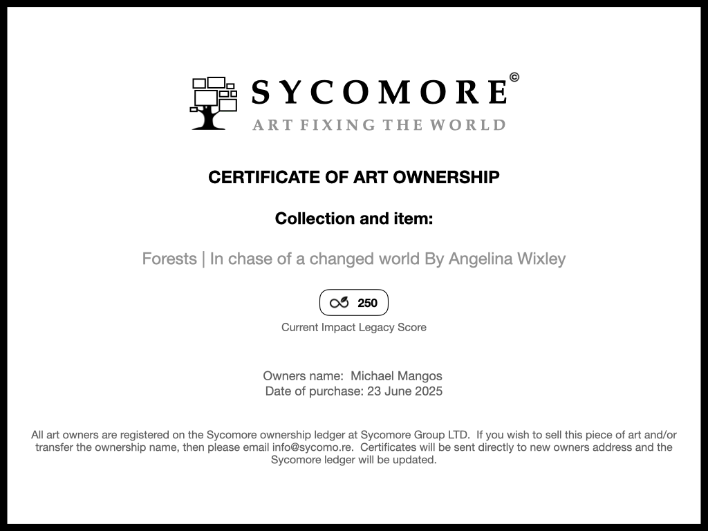 Each Sycomore collection consists of natural art pieces. Each piece and the rightful owner is recorded on the Sycomore ledger and comes with a certificate of ownership. This means your artwork will be mapped to the environmental problem and its subsequent solutions, which are ledgered on the Sycomore platform.